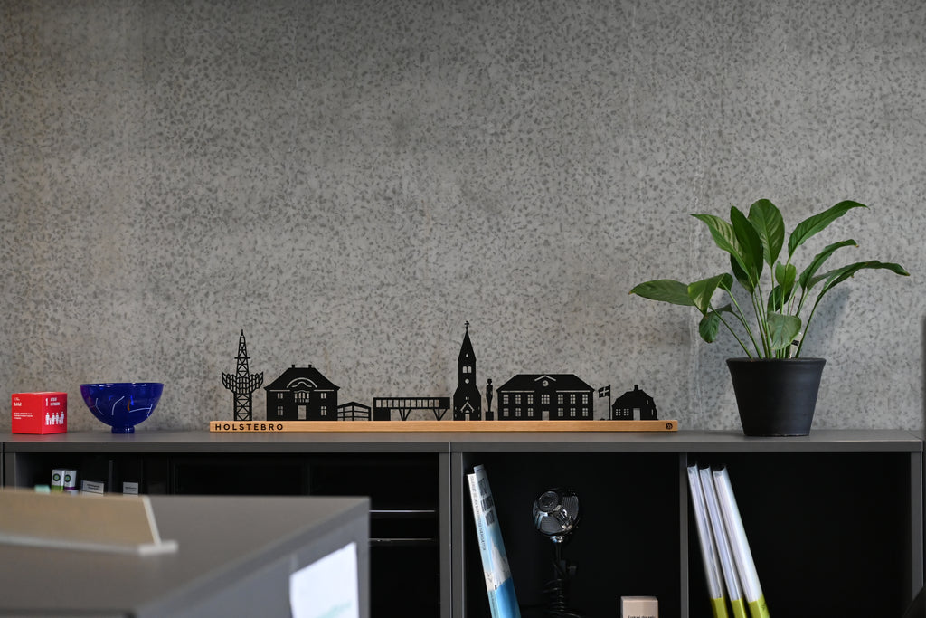 Med det integreret vægophæng har du både mulighed for at sætte Holstebro i en vindueskarm i stuen eller hænge byen på en væg på kontoret. Ved ophæng gemmes skruerne i egetræslisten og der opnås en fin svævende effekt. Den sorte bysilhuet giver et elegant sammenspil mellem lys og skygge og samtidig med en skarp kontrast til det lyse egetræ. Holstebro Skyline er oplagt som en personlig gave, der vil skabe glæde i hjemmet i mange år.